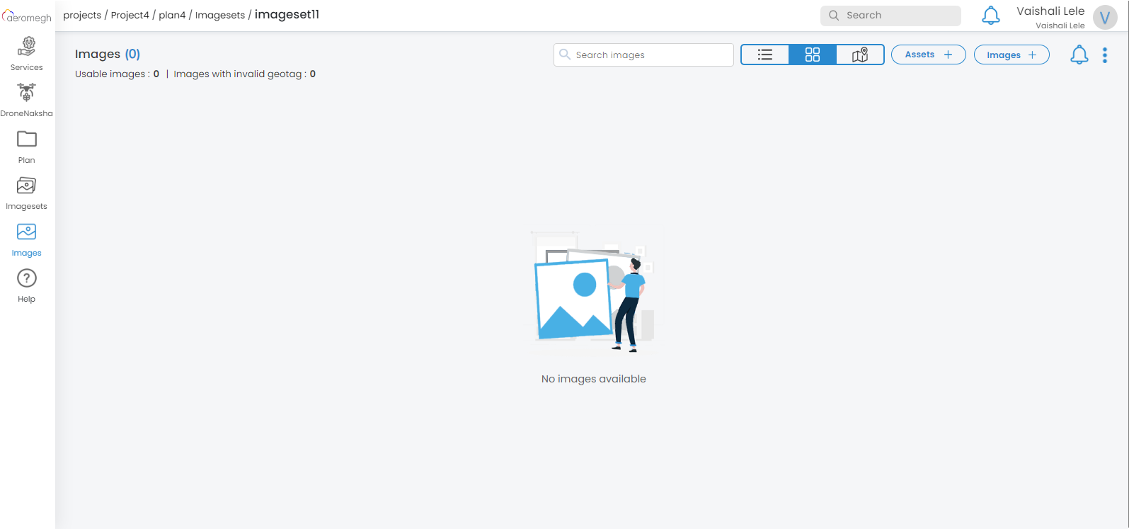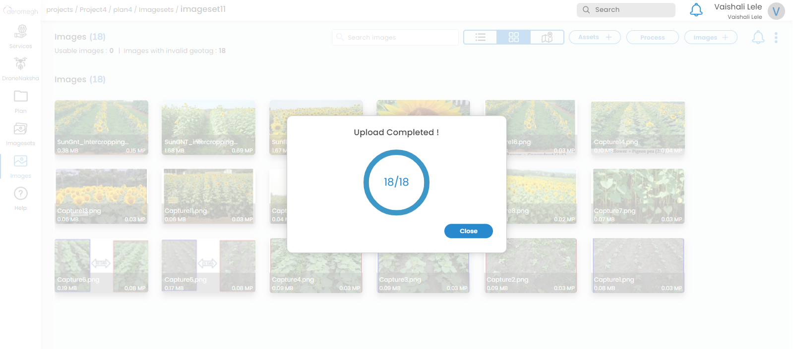 After successfully creating the project, plan, and imageset, the user has to upload the images for processing.