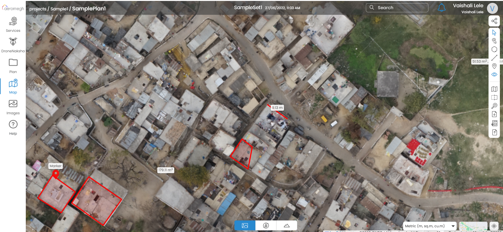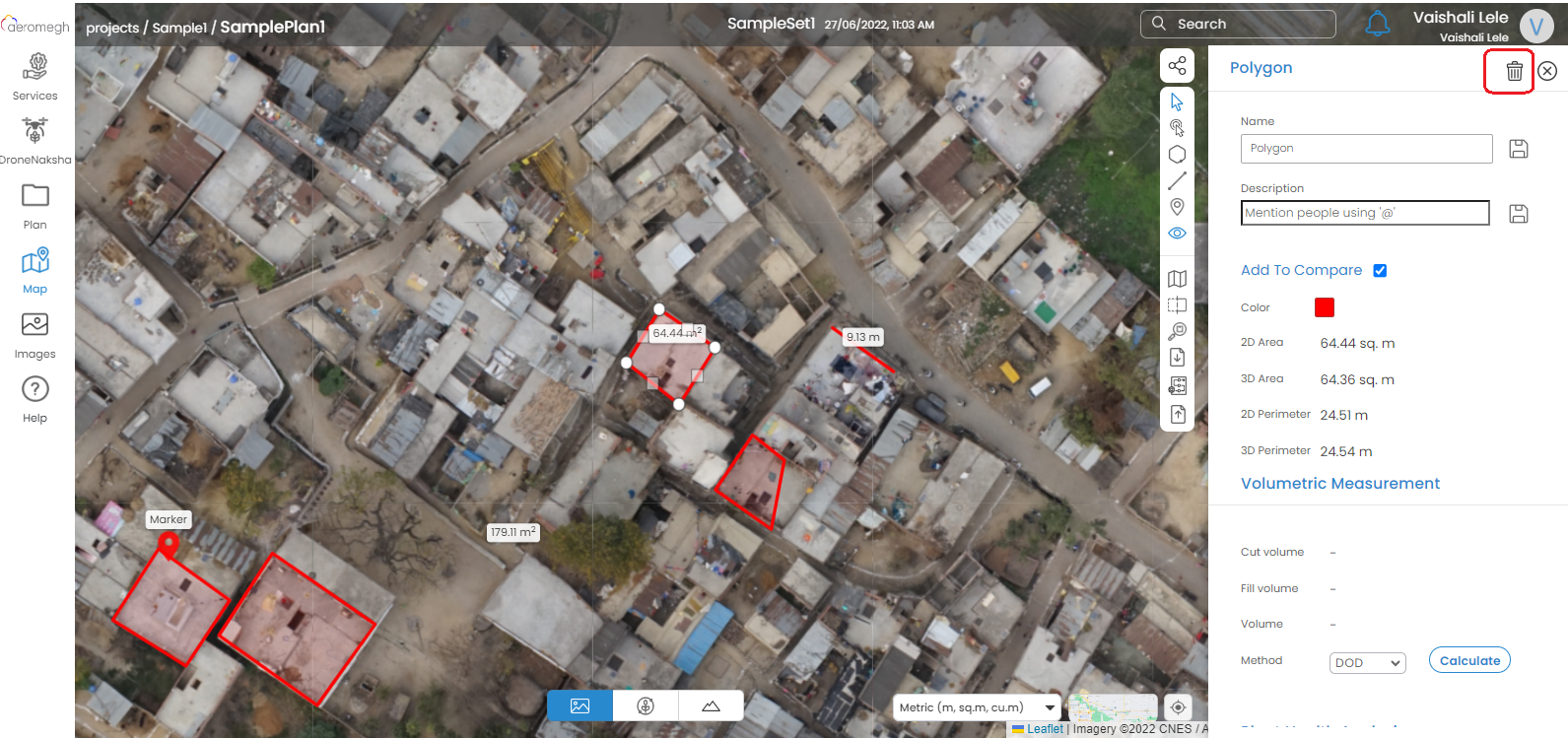DroneNaksha provides the volumetric measurements of the selected area marked on an orthomosaic map. The steps for getting a volumetric measurement are as follows:
